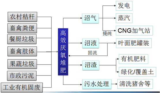 在厭氧條件下,厭氧菌分解糞污中的有機物,產(chǎn)生沼氣,沼渣經(jīng)過分離后再制作生物肥。