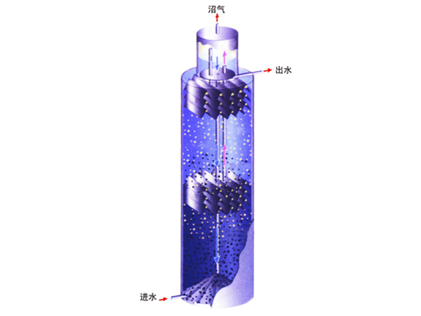 該厭氧反應器從結構上可以看成是由兩個上下重疊的UASB反應器串聯組成,用下面第一個UASB反應器產生的沼氣作為動力,實現了下部混合液內循環(huán),使廢水獲得強化的預處理,上面的第二個UASB反應器對廢水繼續(xù)進行后續(xù)處理,使出水達到預期的處理要求。該厭氧反應器能夠提高處理效能,縮小反應器的容積,從而降低工程投資,節(jié)省占地面積等優(yōu)點。