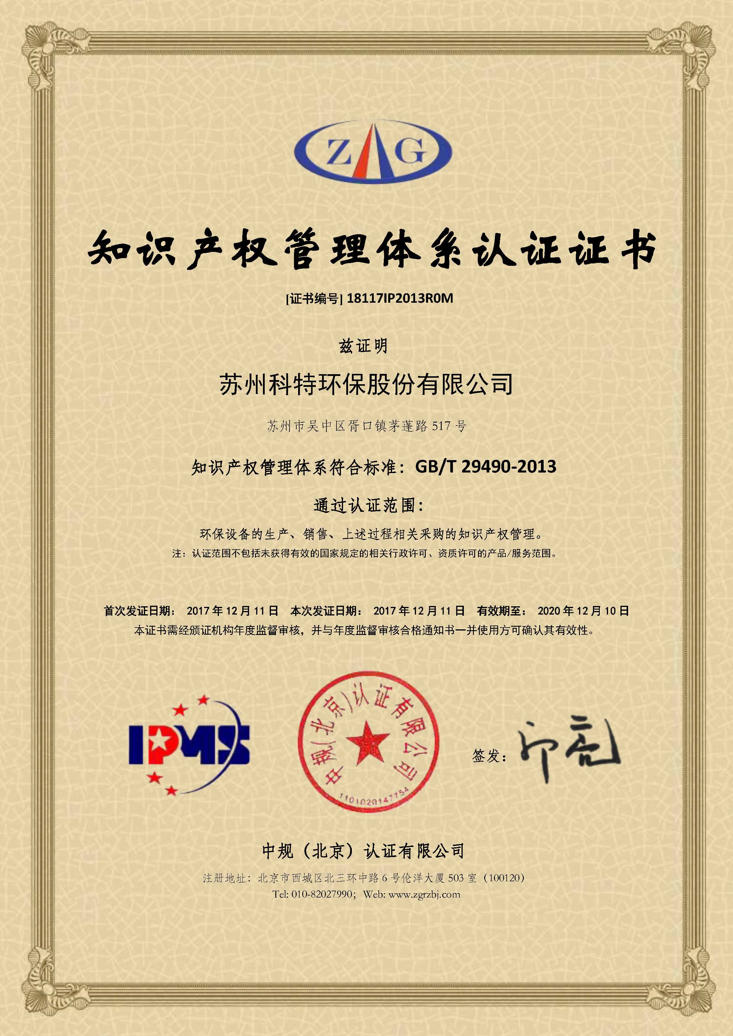 經(jīng)過一個多月的準(zhǔn)備和改正,蘇州科特環(huán)保順利通過現(xiàn)場審核,獲得知識產(chǎn)權(quán)管理體系認(rèn)證證書,今后我們將落實和不斷完善科特的知識產(chǎn)權(quán)管理的各項制度。